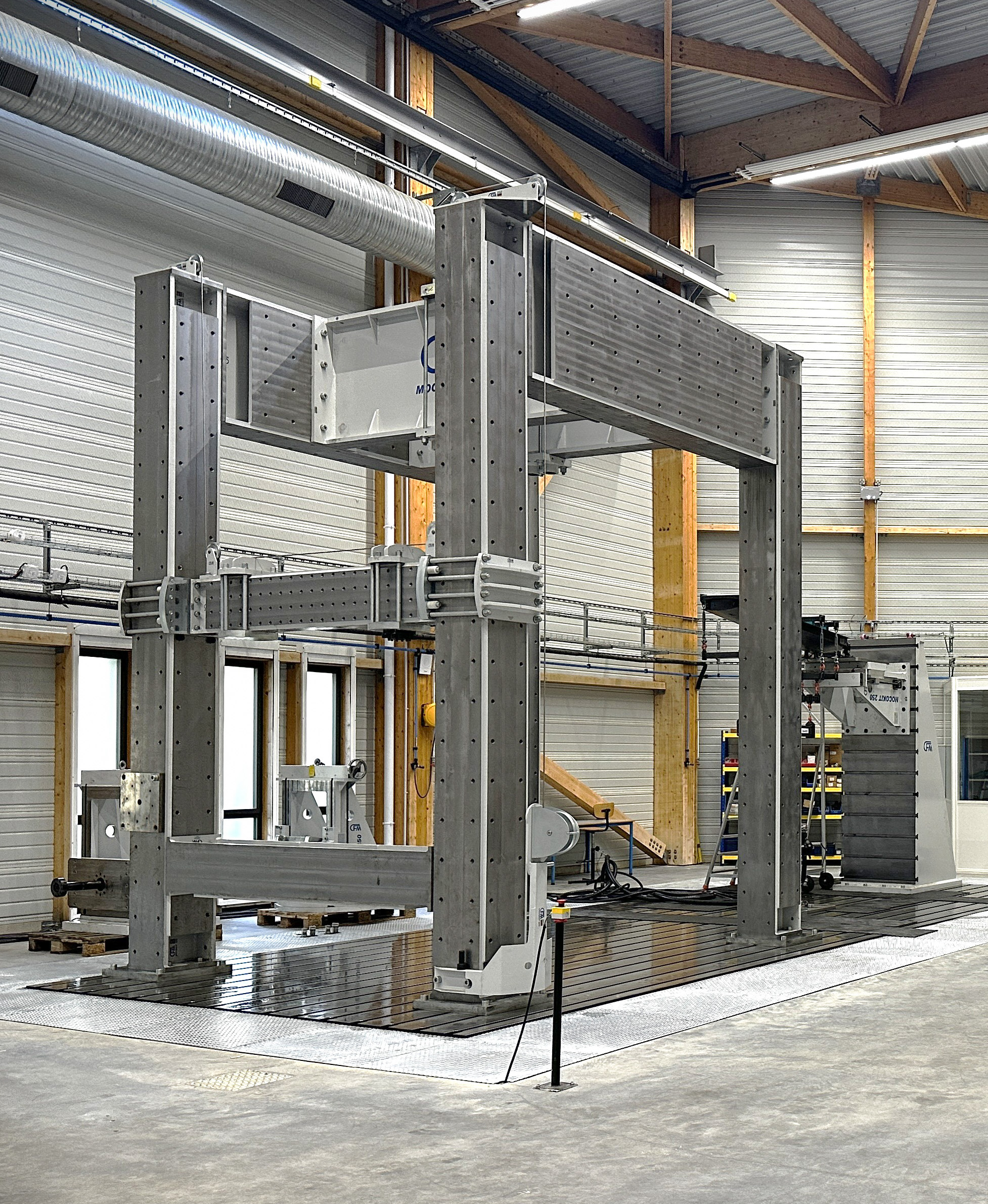 ![]() | Eléments mécaniques (CFM) : Taque : 10m x 4m (Dimensions structure jusqu’à 8m) Portique : hauteur 5.29m Murs (x2) : 1.06m x 1.4m x 3m Esquarres hauteur réglable (x2) Esquarres orientables avec hauteur réglable (x2) | Eléments hydrauliques (Quiri) : - Verins hydrauliques (chargement dynamiques) 25 kN (x2) 110 kN (x4) 250 kN (x1) 620kN (x1) ; 150 mm - Pilotage Asservissement effort/déplacement vérins Jusqu’à 4 essais en simultané Jusqu’à 4 vérins en simultané sur 1 essai |